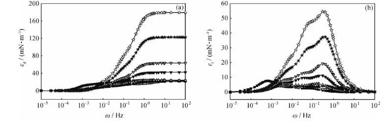 圖5含不同量酸性組分的煤油-1750mg/L HMPAM水溶液體系的界面擴張彈性(εd)和擴張黏性(εi)全頻率譜
