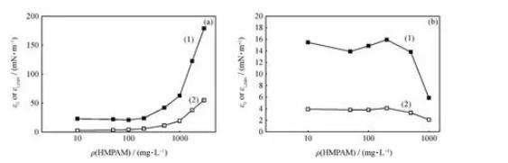 (2)在油-水體系中,原油酸性組分分子與HMPAM分子的疏水部分相互作用,阻礙界面網(wǎng)絡結構的形成,大大降低了界面膜的擴張彈性和擴張黏性。