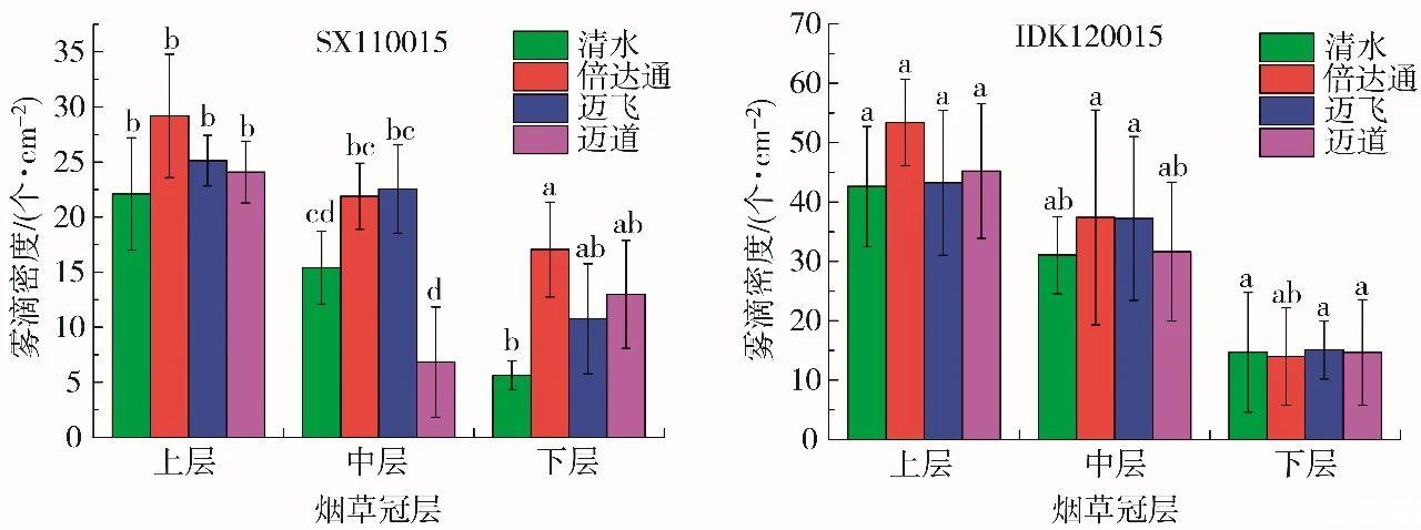 采用IDK120015噴霧時(shí),添加助劑能夠提高藥液霧滴在煙草上、中冠層的霧滴密度。煙草上層,添加倍達(dá)通、邁飛和邁道助劑的霧滴密度分別提高25.2%、1.4%和6.1%;中層分別提高20.5%、19.9%和1.9%;下層添加邁飛助劑的霧滴密度提高2.7%,而添加倍達(dá)通和邁道助劑則分別降低4.8%和0.2%。在煙草上、中、下冠層的藥液霧滴密度均呈遞減的趨勢,下層霧滴密度分別占上層霧滴密度的26.2%、34.9%和32.4%。