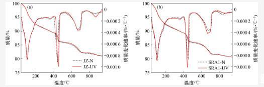 通過TG-DTG程度對比分析60 d齡期時2種環(huán)境條件下水泥水化,熱重分析結(jié)果圖6和表4所示?;瘜W(xué)結(jié)合水和氫氧化鈣的含量可以直觀地反映水化速率和水化程度。如表4所示,經(jīng)過強(qiáng)紫外線照射后,各組樣品的化學(xué)結(jié)合水含量和氫氧化鈣含量呈下降趨勢,這是因為強(qiáng)紫外線照射下樣品中的自由水會更快地蒸發(fā),最終導(dǎo)致水化程度降低。此外,對比2種環(huán)境下的碳酸鈣含量發(fā)現(xiàn),強(qiáng)紫外輻射會促進(jìn)水泥石的碳化。熱重分析結(jié)果與已有的研究結(jié)果相似。