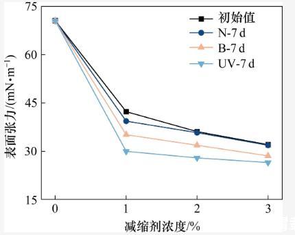 據(jù)以往研究,SRA在水泥基材料表面的吸附率通常在10%以下,90%以上的SRA分子溶于溶劑中(包含吸附在氣液界面上的部分)。因此,SRA減縮的理論基礎(chǔ)主要是毛細(xì)管張力理論。為了進(jìn)一步探索減縮劑在強(qiáng)紫外線輻射環(huán)境下的作用機(jī)理,測試了減縮劑溶液的初始表面張力,以及溶液經(jīng)過3種不同環(huán)境(N,UV,B)處理7 d后的表面張力。試驗結(jié)果如圖8所示。