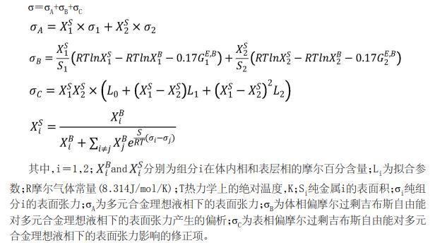 其中,i=1,2,3,……,n;and分別為組分i在體內(nèi)相和表層相的摩爾百分含量;R摩爾氣體常量(8.314J/mol/K);T熱力學上的絕對溫度,K;Si純金屬i的表面積;σi純組分i的表面張力;σA為多元合金理想液相下的表面張力;σB為體相偏摩爾過剩吉布斯自由能對多元合金理想液相下的表面張力產(chǎn)生的偏析;σC為表相偏摩爾過剩吉布斯自由能對多元合金理想液相下的表面張力影響的修正項。