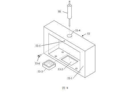 如圖8所示,第三窗形件53的第三邊框部53-1的下邊框上設(shè)置有一個例如長方形的凹坑53-2,并且沿左右方向凹坑53-2位于第三邊框部53-1的中間位置,凹坑53-2內(nèi)設(shè)置有一個積液盆53-3。第三窗形件53的第三邊框部53-1的上邊框上設(shè)置有一個例如圓形的第三通孔53-4,第三通孔53-4沿豎直方向延伸,并且第三通孔53-4位于凹坑53-2的正上方;注射器80包括主體管80-1和固定設(shè)置于主體管80-1下端面的針管80-2,主體管80-1和針管80-2均為內(nèi)部中空的圓形管,并且針管80-2的直徑小于主體管80-1的直徑,針管80-2與主體管80-1的內(nèi)部空腔相連通;注射器80的主體管80-1固定設(shè)置于第三通孔53-4內(nèi),并且針管80-2的末端剛好與攝像機61的中心軸線(即光源62的中心軸線)相交。在本實施例中,第三窗形件53的第三邊框部53-1的上邊框的側(cè)面設(shè)置有一個沿前后方向延伸的第一螺紋孔53-5,并且第一螺紋孔53-5與第三通孔53-4相連通;螺栓53-6設(shè)置于第一螺紋孔53-5內(nèi),螺栓53-6的外螺紋能夠與第一螺紋孔53-5相嚙合,并且螺栓53-6的里端能夠與注射器80的主體管80-1外壁相抵接,從而使得注射器80的主體管80-1固定設(shè)置于第三通孔53-4內(nèi)。