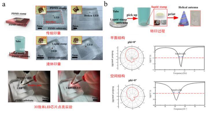 當(dāng)液體印章與待轉(zhuǎn)印器件/單元結(jié)合時,液滴對器件進(jìn)行包裹,進(jìn)而實現(xiàn)保護(hù)器件的作用。相比于傳統(tǒng)彈性印章轉(zhuǎn)印方法,液體的流變特性充分發(fā)揮作用,使得薄膜器件更容易轉(zhuǎn)印到多種復(fù)雜的空間曲面上。通過對固-液界面粘附力的理論分析,提出了基于液滴印章的轉(zhuǎn)印技術(shù),實現(xiàn)了柔性薄膜的高度精確可控轉(zhuǎn)印,并通過實驗證實了理論模型的正確性與該轉(zhuǎn)印方法的可行性。研究人員通過液體印章轉(zhuǎn)印方法,成功實現(xiàn)了30微米超薄LED芯片的轉(zhuǎn)印集成(圖2a為傳統(tǒng)印章和液滴印章轉(zhuǎn)印對超薄LED芯片轉(zhuǎn)印結(jié)果的對比)與錐螺旋微天線與異形曲面的轉(zhuǎn)印集成(圖2b)。此方法利用了表面張力和毛細(xì)作用,可以實現(xiàn)轉(zhuǎn)印期間印章-薄膜作用力的精確調(diào)控,進(jìn)而能夠高效、高質(zhì)量地完成超薄器件的轉(zhuǎn)印;利用二維制備工藝和轉(zhuǎn)印技術(shù),實現(xiàn)了立體空間微結(jié)構(gòu)和異形界面的集成,為曲面電子器件的設(shè)計與制備提供了一種新的方案。