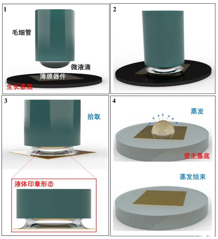 針對當(dāng)前轉(zhuǎn)印技術(shù)中存在的問題,研究人員結(jié)合接觸式和非接觸式轉(zhuǎn)印的特點,提出了一種基于表面張力的液滴轉(zhuǎn)印方法,利用液體的流變特性,通過毛細(xì)管對液滴形態(tài)的控制,調(diào)控固-液界面的粘附力,從而實現(xiàn)柔性器件的轉(zhuǎn)印,該方法減少了超薄柔性器件的轉(zhuǎn)印過程中印章對器件的損傷,同時也為曲面電子器件的制造提供了新的思路。