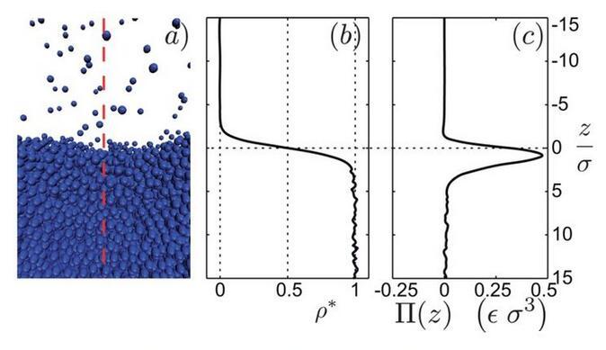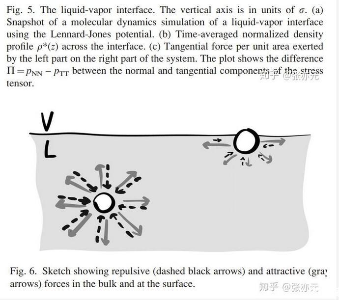 當(dāng)分子間距較小時(shí),斥力為主,分子間距較大時(shí),引力為主。在斥力與引力平衡時(shí),Lennard-Jones勢(shì)能最小。現(xiàn)在,我們就可以來(lái)詳細(xì)地考慮液-氣界面了。圖5a是通過(guò)分子動(dòng)力學(xué)仿真得出的液-氣界面照片,對(duì)應(yīng)的時(shí)間平均密度分布圖是圖5b。從高密度的液體到低密度的氣體發(fā)生在一個(gè)幾個(gè)分子厚度的窄區(qū)域。為了確定毛細(xì)力,我們沿垂直界面方向?qū)⑾到y(tǒng)分為兩個(gè)子系統(tǒng)(圖5a)??紤]左邊子系統(tǒng)對(duì)右邊子系統(tǒng)的單位面積的作用力,即應(yīng)力,在豎直方向上的分布。這個(gè)力有兩個(gè)來(lái)源:壓力P和額外壓力Π(圖5c)。圖5c表明有個(gè)力局部存在于界面附近,其實(shí)這個(gè)力就是表面張力,且這個(gè)力范圍和密度突變的范圍很相似。這說(shuō)明表面張力的確是一個(gè)真實(shí)的力,而不僅僅是表面能的一種純數(shù)學(xué)描述。既然我們發(fā)現(xiàn)在界面附近的確局部存在一個(gè)平行的力,那我們回到問(wèn)題1,為什么表面張力平行于界面而不是垂直于界面?我們注意到圖1僅僅描繪了分子間引力作用。更全面的圖應(yīng)該如圖6所示,包含了引力與斥力作用。在遠(yuǎn)離界面的液體本體內(nèi),由于液體分子周?chē)耐耆珜?duì)稱(chēng)性,分子的受力完全平衡。但是,靠近界面附近的地方,上下對(duì)稱(chēng)性被打破。為修復(fù)豎直方向的力平衡,向上的斥力需平衡向下的引力。而在平行于界面的方向,對(duì)稱(chēng)性仍然存在,平行于界面方向的力平衡仍然存在。這就可以存在一種情況,引力作用的強(qiáng)度與斥力作用的強(qiáng)度不同。實(shí)際上,在界面附近的水平方向上,引力作用比斥力更強(qiáng),這產(chǎn)生了表面張力。