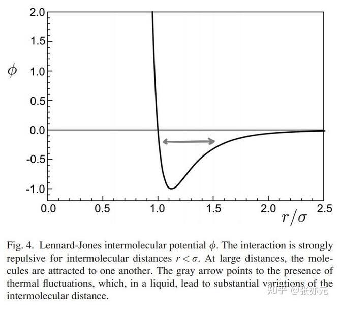 為了從源頭上理解毛細(xì)現(xiàn)象和表面張力,我們首先要考慮的就是液體分子間的作用力。事實(shí)上,一對(duì)液體分子間的作用力要么是引力,要么是斥力,與兩分子間距離相關(guān),一般可用Lennard-Jones勢(shì)能表示(圖4)。