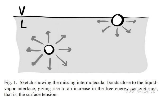 借鑒Gibbs的開(kāi)創(chuàng)性工作,我們可以將表面張力理解成因兩本體相間界面存在導(dǎo)致的額外表面能。液-氣界面附近的液體分子所處的環(huán)境與本體中的分子不同,這種差異經(jīng)常被人用圖1的示意圖表現(xiàn),即近乎一半的分子間引力缺失,這導(dǎo)致自由能的增加,這是熱動(dòng)力學(xué)的觀點(diǎn)。