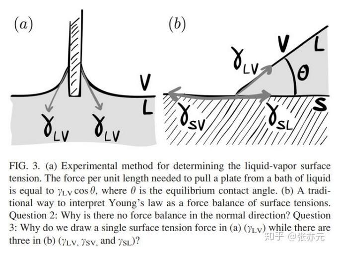 測(cè)量液-氣表面張力的標(biāo)準(zhǔn)方法是測(cè)量將金屬板拉出水面的力,這個(gè)力與表面張力γLV相關(guān)(圖3a)。而對(duì)楊氏方程(圖3b),一般認(rèn)為在接觸線(xiàn)處存在三個(gè)界面張力在固-液界面方向的力平衡γSL+γLVcosθ=γSV。初學(xué)者在此處會(huì)有以下困惑: