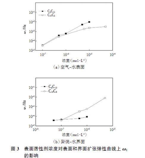 圖3表面活性劑濃度對表面和界面擴(kuò)張彈性曲線上ω1的影響