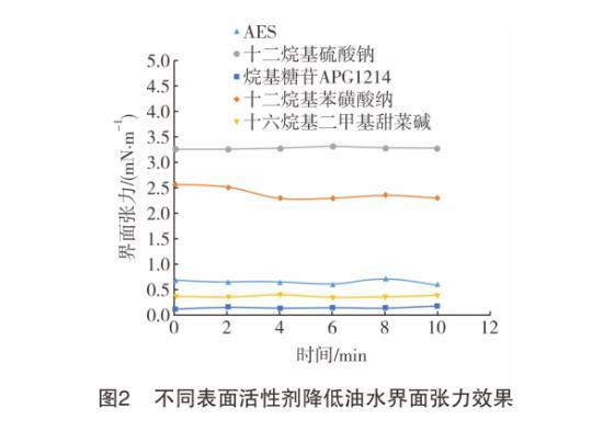 圖2為不同表面活性劑降低油水界面張力的情況。從圖2可知,在5種表面活性劑質(zhì)量分?jǐn)?shù)均為0.2%的情況下,十六烷基二甲基甜菜堿和烷基糖苷APG1214效果最好,分別能將油水界面張力降至0.38 mN/m和0.17 mN/m,低于0.50 mN/m。這是因?yàn)樵惋柡头趾头枷惴种蠧12~C16組分所占比例大,使得這兩種表面活性劑的疏水端碳原子數(shù)與其匹配較好,根據(jù)“相似相溶”原理,這兩種表面活性劑疏水端擴(kuò)散進(jìn)入油相的能力較強(qiáng),因而降低油水界面張力的效果更好。