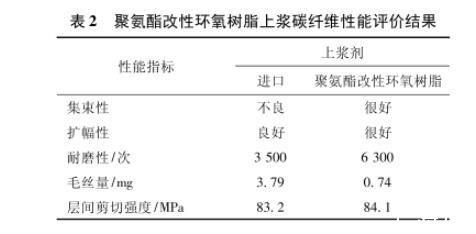 采用聚氨酯改性環(huán)氧樹(shù)脂上漿劑制備的碳纖維性能見(jiàn)表2。