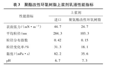 所制備的聚酯改性環(huán)氧樹(shù)脂上漿劑在核磁共振譜圖的1.6×10-6、3.8×10-6、4.8×10-6、6.8×10-6、7.2×10-6處,紅外光譜在3 309 cm-1、2 971/2 870cm-1、1 600 cm-1、1 721 cm-1以及1 103 cm-1等處出現(xiàn)甲基、苯環(huán)、聚酯、聚醚的特征吸收峰,表明結(jié)構(gòu)中存在聚酯多元醇、雙酚A聚醚陰離子表面活性劑等組分。雙酚A聚醚陰離子表面活性劑具有優(yōu)異的乳化性能和極低的浸潤(rùn)性能,在和聚酯多元醇配合的情況下,可顯著降低上漿劑乳液的表面張力,提高上漿效率,增強(qiáng)上漿均勻性和穩(wěn)定性。