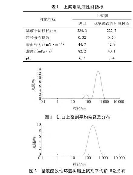 與進(jìn)口上漿劑相比,制備的上漿劑乳液粒徑穩(wěn)定,變化率小,可穩(wěn)定保存;黏度低,不易沾輥絮化;pH呈中性。
