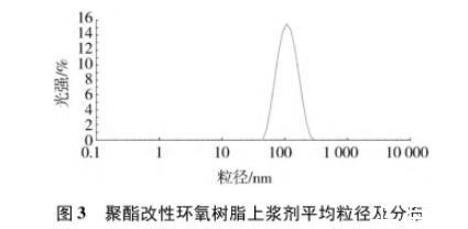 制備的聚酯改性環(huán)氧樹(shù)脂上漿劑乳液性能見(jiàn)表3,粒徑及分布測(cè)試結(jié)果見(jiàn)圖3。