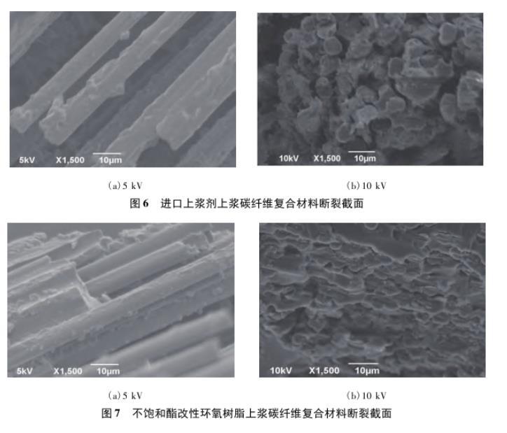 采用進(jìn)口上漿劑和不飽和酯改性環(huán)氧樹脂上漿劑制備的上漿碳纖維復(fù)合材料斷裂截面見圖6~7。