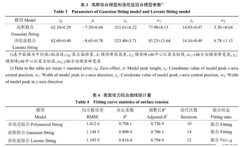 多項(xiàng)式擬合模型的參數(shù)(平均值±標(biāo)準(zhǔn)誤)如下所示:z0=116.16±43.94,A1=?0.23±0.10,A2=0.002±0.001,A3=(?1.19±0.45)×10?5,A4=(2.25±0.88)×10?8,A5=(?1.91±0.64)×10?11,B1=?19.950 0±19.724 9,B2=3.22±3.21,B3=?0.24±0.24,B4=0.009±0.008,B5=(?1.22±1.30)×10?4。表3為高斯擬合模型和洛倫茲擬合模型參數(shù),表4為溶液表面張力3種擬合曲線的統(tǒng)計(jì)量。由表4可以看出,3種擬合方式的決定系數(shù)(R2)均大于0.79,調(diào)整后R2(Adjusted R2)均大于0.73,這說明擬合函數(shù)有意義,且均方根誤差(Root mean square error,RMSE)都小于1.5。3種擬合模型均能夠描述磁場(chǎng)強(qiáng)度和磁化時(shí)長(zhǎng)對(duì)除草劑溶液表面張力的影響,但相比較于其他2種擬合方式,洛倫茲擬合R2為0.816 4,調(diào)整后R2為0.794 0,兩者均大于其他2種擬合方式,R2與調(diào)整后R2越大,說明擬合效果越好;RMSE為1.105 9,均小于其他2種擬合方式,RMSE越小,說明預(yù)測(cè)模型描述試驗(yàn)數(shù)據(jù)越精確。
