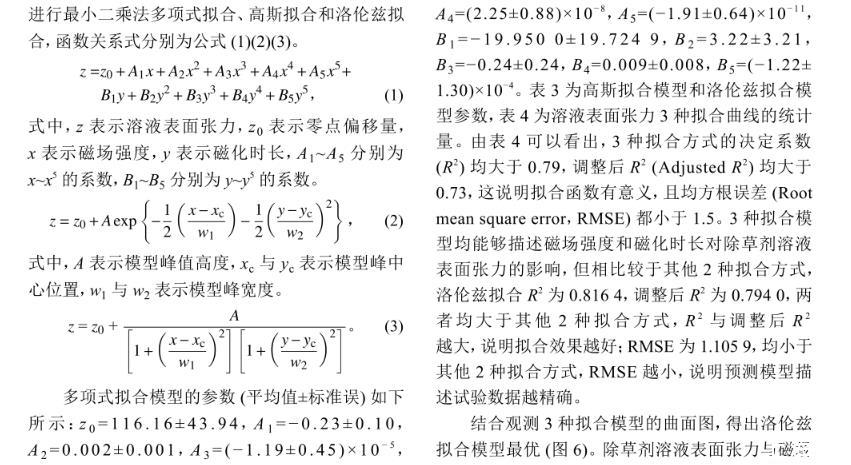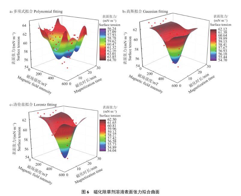 結(jié)合觀測(cè)3種擬合模型的曲面圖,得出洛倫茲擬合模型最優(yōu)(圖6)。除草劑溶液表面張力與磁場(chǎng)強(qiáng)度和磁化時(shí)長(zhǎng)的關(guān)系式見公式(4),為研究磁化作用對(duì)除草劑溶液表面張力的影響提供理論參考。
