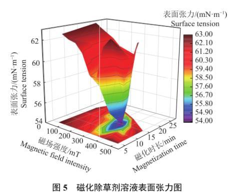 為了直觀地分析磁場(chǎng)強(qiáng)度和磁化時(shí)長(zhǎng)2個(gè)因素共同作用對(duì)除草劑溶液表面張力的影響規(guī)律,建立以磁場(chǎng)強(qiáng)度和磁化時(shí)長(zhǎng)為自變量、以溶液表面張力為因變量的二元函數(shù),使用OriginPro 2018繪制磁場(chǎng)強(qiáng)度和磁化時(shí)長(zhǎng)對(duì)表面張力影響規(guī)律的空間曲面分布圖(圖5)。由圖5可以看出,磁場(chǎng)強(qiáng)度和磁化時(shí)長(zhǎng)對(duì)溶液表面張力影響規(guī)律的空間曲面分布圖呈峰值為負(fù)值的高斯空間分布規(guī)律,即空心圓錐面分布,這說明并不是磁場(chǎng)強(qiáng)度越大或者磁化時(shí)間越長(zhǎng),除草劑溶液的表面張力就越小,而是存在處理效果最佳的磁場(chǎng)強(qiáng)度和磁化時(shí)長(zhǎng)。磁化除草劑溶液表面張力試驗(yàn)結(jié)果見表2。當(dāng)磁場(chǎng)強(qiáng)度為350 mT、磁化時(shí)長(zhǎng)為15.0 min時(shí),除草劑溶液表面張力值最小,為54.0 mN/m,下降14.96%,磁化效果最佳。