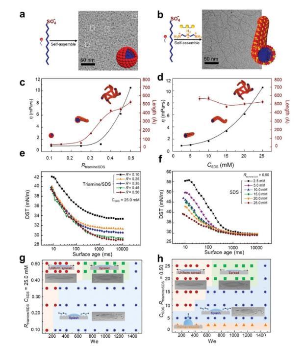 圖2.撞擊結果的物理化學性質和相圖。a,b)SDS和三胺/SDS聚集狀態(tài)的示意圖和低溫透射電鏡圖像。a)單獨的SDS形成小的球形膠束,用虛線矩形突出顯示。b)加入三胺后,三胺/SDS形成長而密集的纏結線性膠束。c,d)在不同摩爾比R和摩爾濃度CSDS下三胺/SDS的粘度和聚集長度。在臨界摩爾比或摩爾濃度之后,膠束伸長并纏結成網絡結構,導致粘度急劇增加。e,f)不同R和CSDS下三胺/SDS的動態(tài)表面張力(DST)曲線。隨著R和CSDS的增加,初始和平衡表面張力均顯著降低。g,h)不同We數下三胺/SDS液滴撞擊超疏水表面的動態(tài)行為相圖。在高We下,含有三胺/SDS添加劑的液滴只有在特定的摩爾比(0.45–0.50)和特定的摩爾濃度(>20.0×10?3 m)下才能完全沉積在超疏水表面上。