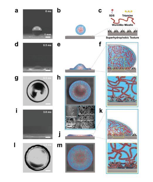 圖3.活性低聚表面活性劑高速撞擊超疏水表面后均勻鋪展的示意圖。a、b)液滴包含三維纏結的蠕蟲狀膠束網絡。c)SDS、三胺、蠕蟲狀膠束和具有微/納米結構的超疏水表面的示意圖。d–h)表面活性劑分子快速擴散到新形成的界面,并緊密堆積在水-空氣界面。蠕蟲狀膠束被迫伸展以固定水。在快速擴散過程中,擴散邊緣穩(wěn)定且均勻。h)蠕蟲狀膠束的密集網絡纏繞著基底的微納米結構,三胺/SDS液滴撞擊后的低溫掃描電鏡圖像支持了這一觀點,其中較大的圖像顯示了較小圖像底部的網絡。f)表面活性劑分子與基質具有很強的相互作用,蠕蟲狀膠束網絡與基質的微/納米結構纏繞在一起。i–m)在最終平衡狀態(tài)下,致密的蠕蟲狀膠束存在于擴散外圍并與微/納米結構纏繞在一起。左欄中所有液滴的比例尺均為1毫米。