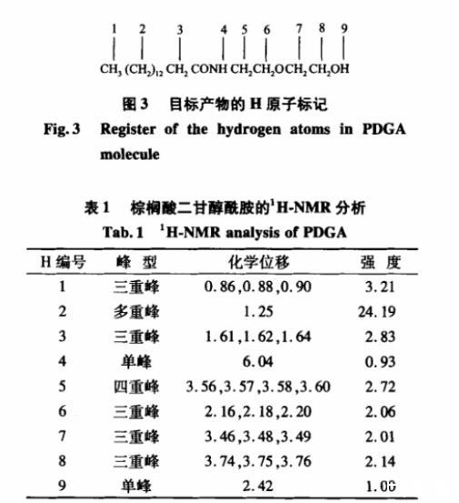 1)以四氫呋喃作溶劑,在氧化鎂存在下,通過(guò)棕櫚酸酰氯和二甘醇胺在0~5℃下反應(yīng)可以合成棕櫚酸二甘醇酰胺。在優(yōu)化反應(yīng)條件下產(chǎn)率可達(dá)到95%。經(jīng)紅外、質(zhì)譜、核磁等表征,合成產(chǎn)物與目標(biāo)產(chǎn)物的分子結(jié)構(gòu)相符,為一種單一化合物。
