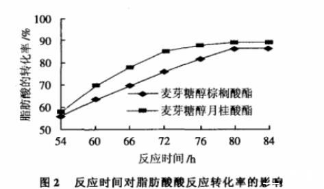 綜合上述實驗結(jié)果,以脂肪酶Novozym 435為催化劑,用量為0.24g/mmol脂肪酸,脂肪酸用量為1mmol,麥芽糖醇用量為2.0mmol,溶劑用量為10mL,在60℃條件下反應(yīng)80h,棕櫚酸和月桂酸的轉(zhuǎn)化率分別達(dá)91%和95%。該結(jié)果是本實驗條件范圍內(nèi)的最好結(jié)果。
