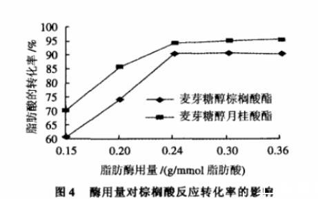 由圖4可見,在本實驗條件下,當(dāng)酶的用量增加時,脂肪酸的反應(yīng)轉(zhuǎn)化率增加。當(dāng)酶的用量為0.24g/mmol脂肪酸時,催化效果最好,棕櫚酸及月桂酸的反應(yīng)轉(zhuǎn)化率分別為達(dá)到90.6%和94.3%。
