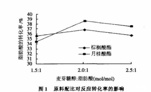 由圖1可知,在原料配比麥芽糖醇:脂肪酸酸分別使用1.5:1、2:1、2.5:1進(jìn)行反應(yīng)時,麥芽糖醇:脂肪酸為2:1時,脂肪酸的反應(yīng)轉(zhuǎn)化率是最好的,但是,結(jié)果相差不大。即在本實驗條件下原料配比對反應(yīng)的影響較小。分析原因,是因為麥芽糖醇和脂肪酸為互不相溶體系,在反應(yīng)中,用丙酮做溶劑,即使能建立一個均相的反應(yīng)體系,由于麥芽糖醇在丙酮中的溶解度比較小,溶液中隨麥芽糖醇的量增加而改變不大。而當(dāng)麥芽糖醇達(dá)到一定用量后,會破壞原有的平衡,導(dǎo)致脂肪酸反應(yīng)的轉(zhuǎn)化率降低。所以,反應(yīng)中選擇麥芽糖醇:脂肪酸的配比為2:1為反應(yīng)的最佳配比。