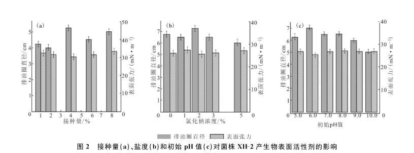圖2接種量(a)、鹽度(b)和初始pH值(c)對菌株XH-2產(chǎn)生物表面活性劑的影響