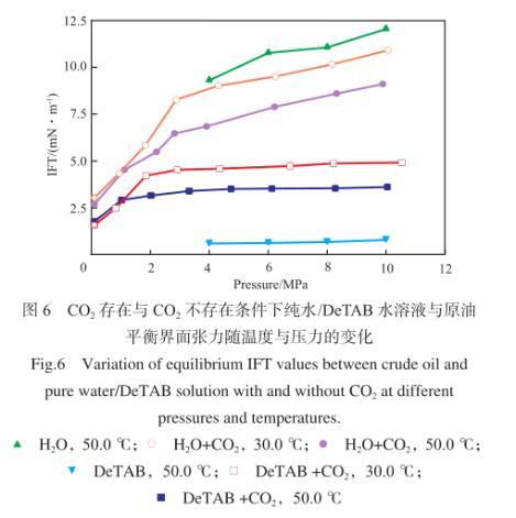 圖6 CO2存在與CO2不存在條件下純水/DeTAB水溶液與原油平衡界面張力隨溫度與壓力的變化