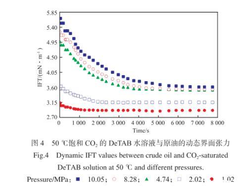 圖4 50℃飽和CO2的DeTAB水溶液與原油的動(dòng)態(tài)界面張力