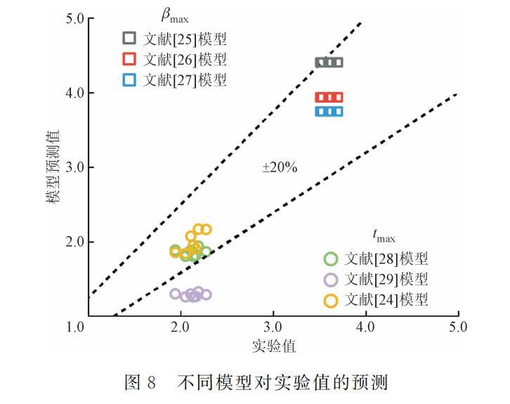 式中:tmax,pre和βmax,pre為使用各模型的最大鋪展時間和最大鋪展因子預(yù)測值;tmax,exp和βmax,exp為最大鋪展時間和最大鋪展因子實驗值。如圖8所示,不同公式的預(yù)測結(jié)果不同,對于最大鋪展因子,盡管不同學(xué)者提出的表達(dá)式對實驗結(jié)果的預(yù)測準(zhǔn)確率均較好,單個數(shù)據(jù)點的偏差均在20%以內(nèi),然而由于表達(dá)式的限制,無法針對液滴沖擊不同水平壁面過冷度的實驗工況進(jìn)行預(yù)測,存在一定缺陷。對于最大鋪展時間,Huang和Chen等人提出的表達(dá)式預(yù)測效果較差,Wildeman等提出的表達(dá)式預(yù)測效果較好,相對平均偏差為12.32%,但由于其表達(dá)式內(nèi)不包含水平壁面過冷度的影響因素,因而預(yù)測效果略差于Shang等提出的表達(dá)式,其相對平均偏差為6.05%。綜上所述,現(xiàn)有最大鋪展時間的表達(dá)式能較好預(yù)測乙醇液滴沖擊過冷水平壁面的鋪展動力學(xué)行為,但最大鋪展因子表達(dá)式仍需進(jìn)一步探索。