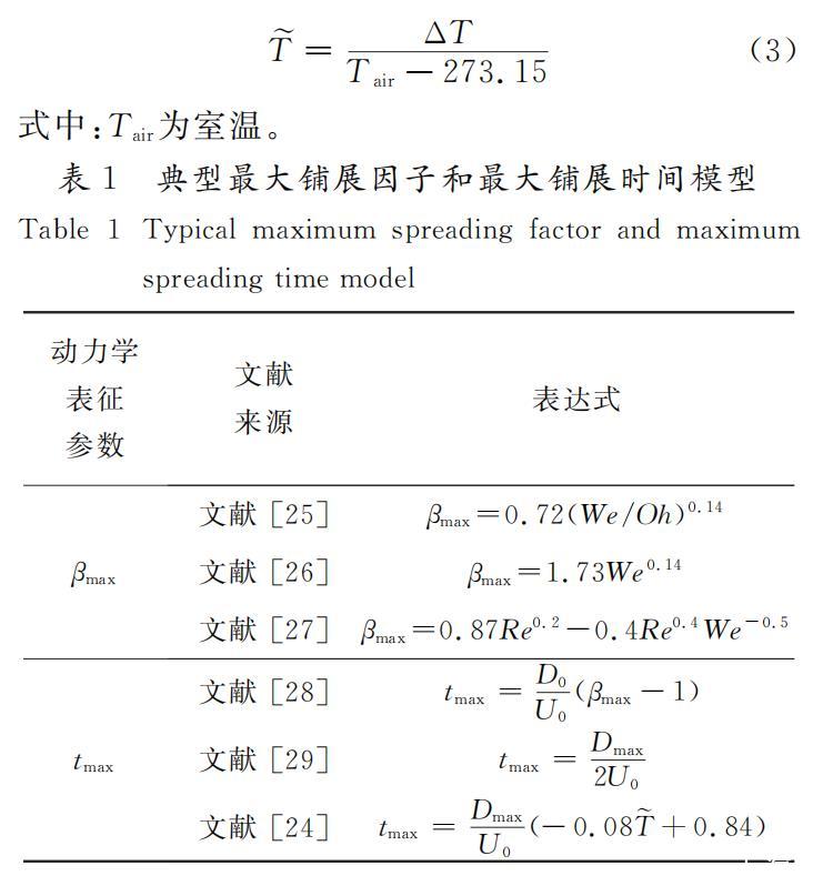 如表1所示,Bayer和Megaridis認(rèn)為液滴沖擊水平壁面的最大鋪展因子與韋伯?dāng)?shù)、奧內(nèi)佐格數(shù)有關(guān),并提出了相關(guān)關(guān)聯(lián)式。Roisman認(rèn)為最大鋪展因子與雷諾數(shù)、韋伯?dāng)?shù)均有關(guān),他采用半假設(shè)半理論的方法,從動量守恒理論出發(fā),提出了最大鋪展因子的表達(dá)式。針對最大鋪展時間,Wildeman等認(rèn)為,最大鋪展時間與最大鋪展因子有關(guān),結(jié)合實驗數(shù)據(jù),對最大鋪展時間進(jìn)行了修正。Shang等探究了水滴沖擊過冷水平壁面的鋪展動力學(xué)行為,并將水平壁面過冷度引入最大鋪展時間模型,重新定義無量綱過冷溫度