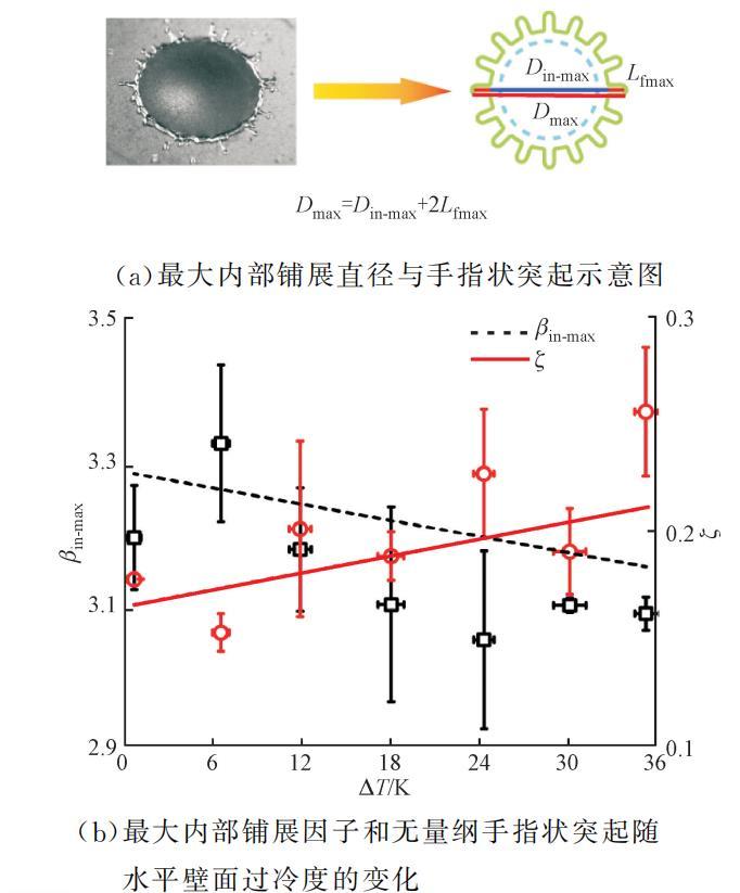 圖7 液滴形狀簡化與最大內(nèi)部鋪展因子和無量綱手指狀突起隨水平壁面過冷度的變化