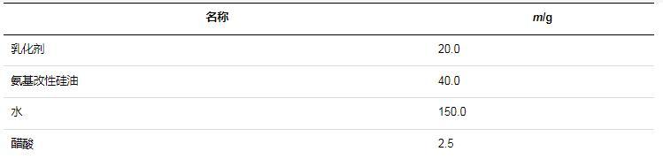 氨基改性硅油在未經(jīng)乳化處理之前,通常為一種油狀或半固態(tài)的物質(zhì),不易與水相混合。而氨基改性硅油柔軟劑需要在水中分散均勻,才能被紡織物充分吸收和利用,發(fā)揮柔軟、抗靜電等作用。因此,上述步驟下制得的氨基改性硅油還需要進(jìn)一步的乳化處理,才能形成氨基改性硅油柔軟劑,否則不能發(fā)揮柔軟劑的作用,反而還會損傷紡織物。室溫下,將乳化劑、氨基改性硅油、醋酸與水按照一定的比例混合,然后200 r/min攪拌5 min,即可制成氨基改性硅油柔軟劑。乳化方案中各物質(zhì)比例見表1。