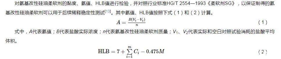 對氨基改性硅油柔軟劑的黏度、氨值、HLB值進(jìn)行檢驗,并對照行業(yè)標(biāo)準(zhǔn)HG/T 2554—1993《柔軟劑SG》,以保證制得的氨基改性硅油柔軟劑可以用于后續(xù)稀釋穩(wěn)定性測試。其中氨值、HLB值按照下式(1)和(2)計算。