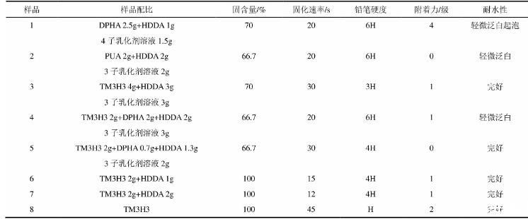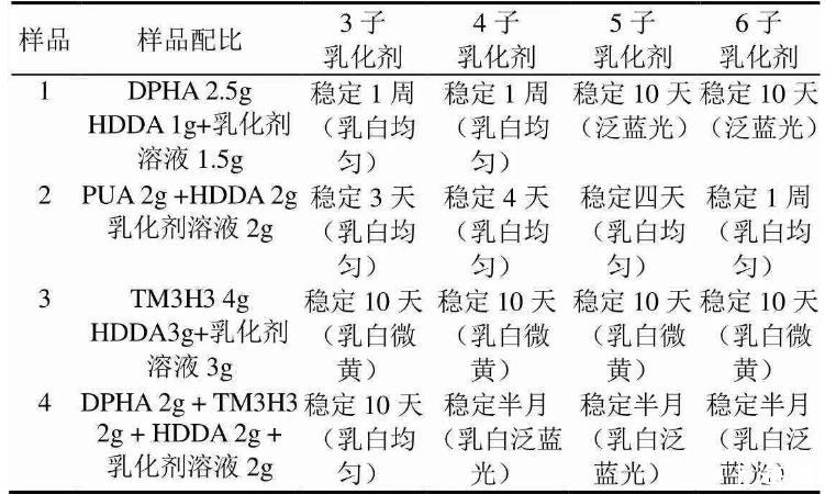中和后得到的桐油基多子乳化劑能夠乳化黏度較大的光固化單體及低聚物形成穩(wěn)定的水乳液。不同乳化劑乳化性能不同,其穩(wěn)定性和外觀也有較大差別,乳液性能列于表1。6子乳化劑乳化的HDDA水乳液(固含量60%)的穩(wěn)定性能達到3個月以上,乳液長期放置分層后經(jīng)攪拌能二次乳化形成均勻的乳液。