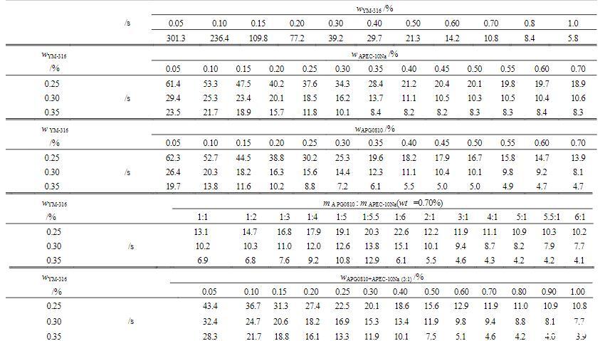 由表2可知,YM-316在質(zhì)量分數(shù)較低時起泡能力較低,25%析液時間較長,隨著質(zhì)量分數(shù)的升高,起泡高度呈現(xiàn)上升趨勢,25%析液時間呈縮短趨勢。鑒于YM-316質(zhì)量分數(shù)在0.25%~0.35%內(nèi),兼具較好的發(fā)泡性能和泡沫穩(wěn)定性,本實驗選擇質(zhì)量分數(shù)為0.25%、0.30%和0.35%的YM-316溶液,分別與APEC-10Na和APG0810進行復(fù)配,研究復(fù)配溶液的泡沫性能。由表2可以看出,APEC-10Na和APG0810的引入,有助于提高溶液的發(fā)泡能力。當(dāng)APEC-10Na和APG0810質(zhì)量分數(shù)在0.2%~0.5%時,與YM-316復(fù)配效果最好,其中0.3%YM-316溶液與0.3%~0.5%APEC-10Na或APG0810復(fù)配后,溶液起泡效果和析液時間均較佳。綜合起泡能力和泡沫穩(wěn)定性兩方面性能,0.3%YM-316與0.7%的APEC-10Na和APG0810(APEC-10Na∶APG0810=1∶3)混合物組成的復(fù)配溶液具有最優(yōu)泡沫性能,其起泡高度最高達298mm,同時泡沫的25%析液時間可達到397s。