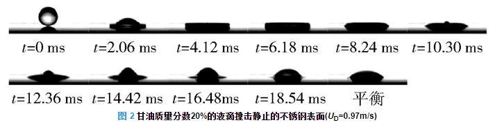 圖2是一個(gè)質(zhì)量分?jǐn)?shù)20%的甘油水溶液液滴撞擊靜止固體表面的典型過(guò)程。液滴(D0=2.85mm)以0.97m/s的速度撞擊在不銹鋼表面上(t=0ms),經(jīng)過(guò)鋪展達(dá)到最大鋪展面積(t=2.06ms),隨后經(jīng)歷回縮、再鋪展以及震蕩的過(guò)程(t=4.12~18.54ms),直至達(dá)到平衡。