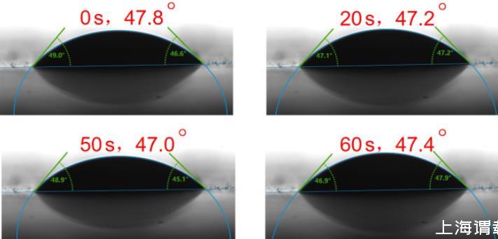 圖61 g/L的C72-MPB水溶液在PTFE上不同時(shí)間的潤濕狀態(tài)