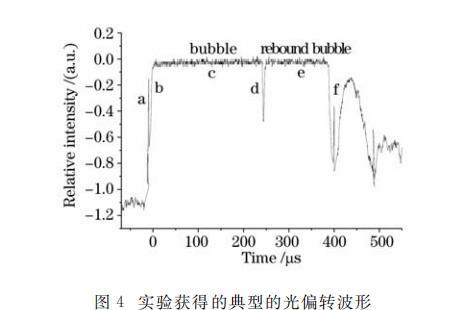 圖3給出了探測(cè)光經(jīng)過脈動(dòng)空泡的示意圖,圖中空泡脈動(dòng)特性曲線是基于空泡半徑隨時(shí)間變化的數(shù)值模擬得到的。圖4即為由探測(cè)裝置圖2(a)獲得的對(duì)應(yīng)的典型光偏轉(zhuǎn)信號(hào)波形圖,它包含了激光作用于水中靶材時(shí)的三種物理現(xiàn)象和過程,即激光等離子體沖擊波、等離子體空泡及其反彈現(xiàn)象、空泡潰滅沖擊波。圖中峰a為激光等離子體沖擊波;c為等離子體空泡信號(hào);e為空泡反彈信號(hào);f為空泡收縮到最小泡體積時(shí)輻射的沖擊波信號(hào);b為空泡膨脹壁;d為空泡收縮壁。