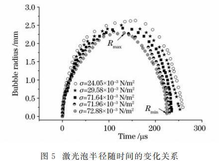從圖5可以看出,表面張力減緩了空泡的膨脹過程。在初期,空泡膨脹變緩的現(xiàn)象不甚明顯,愈到后期越明顯。液體張力越大,空泡對(duì)應(yīng)的最大泡半徑越??;表面張力加速了空泡的收縮。表面張力越大,空泡收縮所能達(dá)到的最小泡半徑越小,且表面張力縮短了空泡脈動(dòng)周期。從圖5還可以看出表面張力對(duì)空泡潰滅的影響要強(qiáng)于對(duì)膨脹的影響。此外,激光泡半徑隨表面張力變化與液體的表面張力數(shù)值并不為線性關(guān)系,其關(guān)系有待研究。