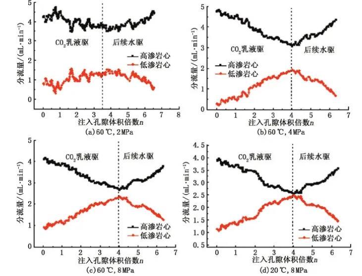 相比于高滲巖心,低滲巖心中由于毛管力較大,使得CO2乳液液滴與液膜之間的壓差大,導(dǎo)致CO2乳液易發(fā)生破裂而形成氣竄,減弱了CO2乳液的封堵性能,從而降低了流動阻力,同時乳液更傾向于進(jìn)入高滲巖心,在巖心滲流過程中疊加的賈敏效應(yīng)會使高滲巖心的滲流阻力不斷增加,直至大于低滲巖心的滲流阻力,依據(jù)這一機(jī)制CO2乳液能夠?qū)崿F(xiàn)分流作用。