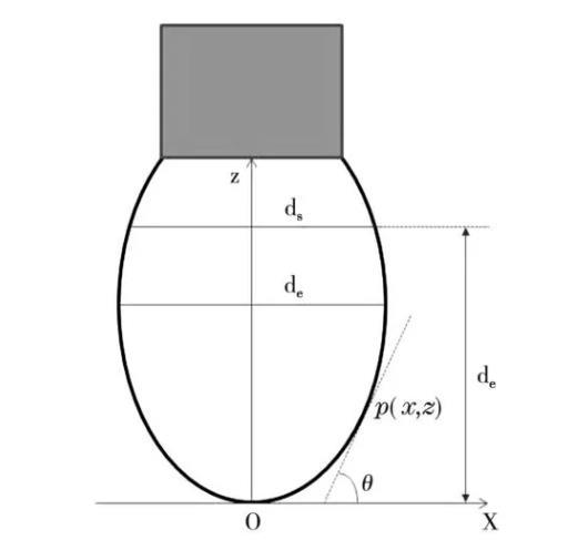 對(duì)于圖1所示的液體懸滴,以懸滴頂點(diǎn)O為坐標(biāo)原點(diǎn),該點(diǎn)處的水平切線為x軸,懸滴輪廓的對(duì)稱軸為z軸,建立平面直角坐標(biāo)系。設(shè)懸滴輪廓上任意一點(diǎn)p的坐標(biāo)為(x,z),p點(diǎn)處切線與x軸的夾角為θ。