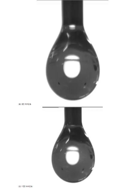 根據(jù)液滴的形成過程,實(shí)驗(yàn)選用液滴下落前的臨界懸停狀態(tài)圖像,進(jìn)一步測(cè)量了不同黏滯性硅油的表面張力系數(shù),圖4為黏度系數(shù)為50、100、350和500 mm2/s硅油樣品的懸滴形態(tài)照片。