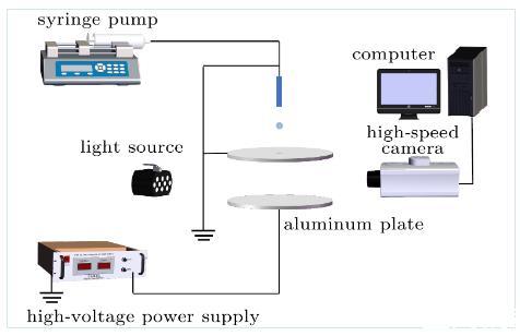 在本實(shí)驗(yàn)中,將兩塊直徑為10cm的圓形鋁板沿著垂直方向放置,其間隔固定為20mm。在上極板中心位置開一個(gè)直徑為5mm的孔口,以便液滴從上極板上方滴落,穿過上極板與下極板發(fā)生撞擊行為。為了實(shí)現(xiàn)垂直電場(chǎng)的形成,將高壓直流電源與下極板相連,上極板作接地處理,這樣的結(jié)構(gòu)產(chǎn)生了一個(gè)垂直電場(chǎng)和一個(gè)帶電的基底。此外,不銹鋼針管(G24,外徑0.55m,內(nèi)徑0.27mm)通過毛細(xì)管連接到微流注射泵上,使液滴以恒定的撞擊速度滴落到下極板。為了消除靜電對(duì)實(shí)驗(yàn)的影響,將針管作接地處理,確保液滴在進(jìn)入電場(chǎng)之前不攜帶任何感應(yīng)電荷。