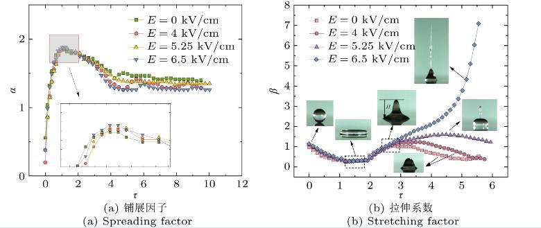 圖3不同場(chǎng)強(qiáng)下液滴無(wú)量綱因子隨無(wú)量綱時(shí)間變化(We=17.8)