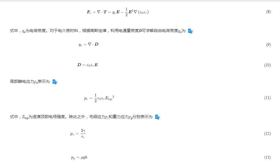 圖4(a)為液滴頂端所受力的方向和液滴整體電荷分布。液滴接觸下極板后,由于離子遷移和極化電荷的產(chǎn)生,中性液滴立即極化,其頂部帶正電荷,底部帶負(fù)電荷。根據(jù)庫(kù)倫定律,電場(chǎng)方向垂直向上,作用在液滴頂部的靜電力Fe是向上的,與電場(chǎng)方向相同,使液滴不斷向上拉伸,液滴拉伸高度增加,而表面張力Fγ和重力G使液滴向下收縮。基于上述的分析,各個(gè)模態(tài)的產(chǎn)生機(jī)理均可通過(guò)靜電力、表面張力和重力三者間的博弈關(guān)系來(lái)分析。三種作用力對(duì)液滴的影響大小可用局部靜電應(yīng)力pe、毛細(xì)應(yīng)力pγ和重力應(yīng)力pg來(lái)表示。靜電力的大小由麥克斯韋應(yīng)力張量T的散度給出,可表示為