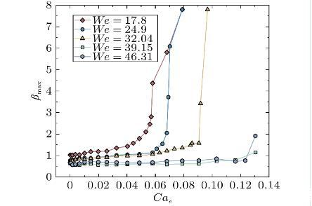 圖6描述了不同韋伯數(shù)下液滴最大無量綱拉伸系數(shù)βmax的對比趨勢。最大拉伸系數(shù)值是在式(5)的基礎上求?。害耺ax=Hmax/D0,其中Hmax為液滴在撞擊過程中達到的最大拉伸高度??梢园l(fā)現(xiàn),當實驗條件設定為低韋伯數(shù)和高電毛細數(shù)時,液滴的最大拉伸系數(shù)明顯增大,甚至在此條件下部分液滴產生了射流模態(tài),所形成的液絲長度超出了上極板的界限。除此之外,前三組韋伯數(shù)下的液滴撞擊實驗結果分析,得到結論:韋伯數(shù)的增大,直接導致液滴達到噴射狀態(tài)所需的電毛細數(shù)相對應增大。
